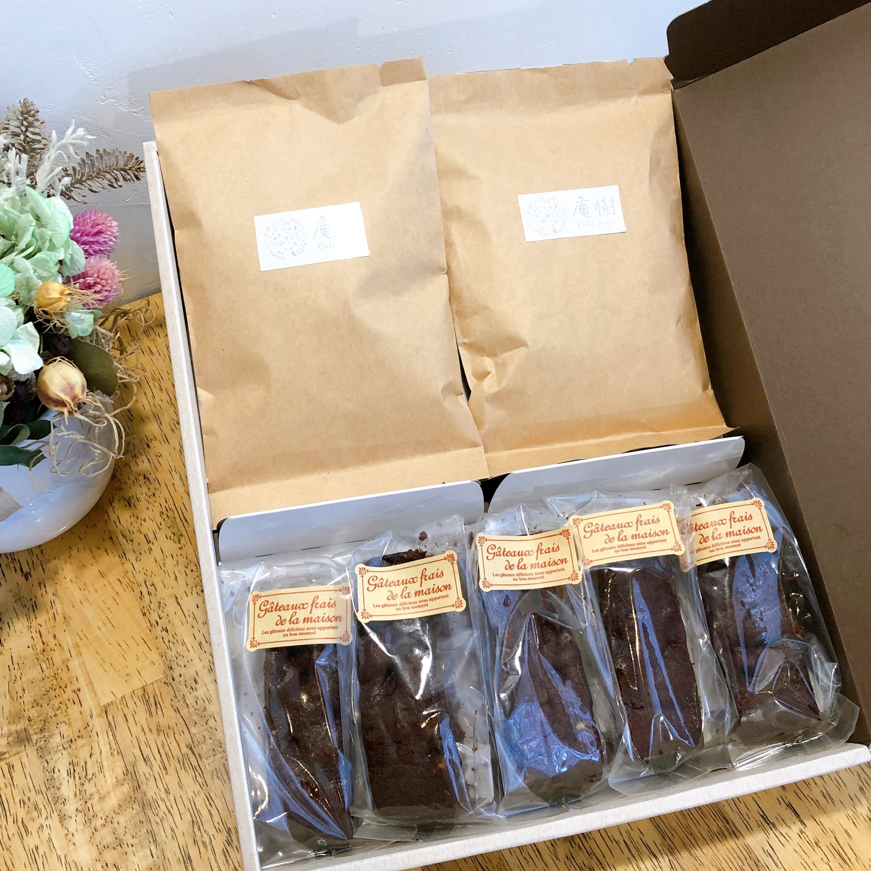 珈琲200g(100g×2)とチョコブラウニー5本をギフトボックスに入れてお届けします。